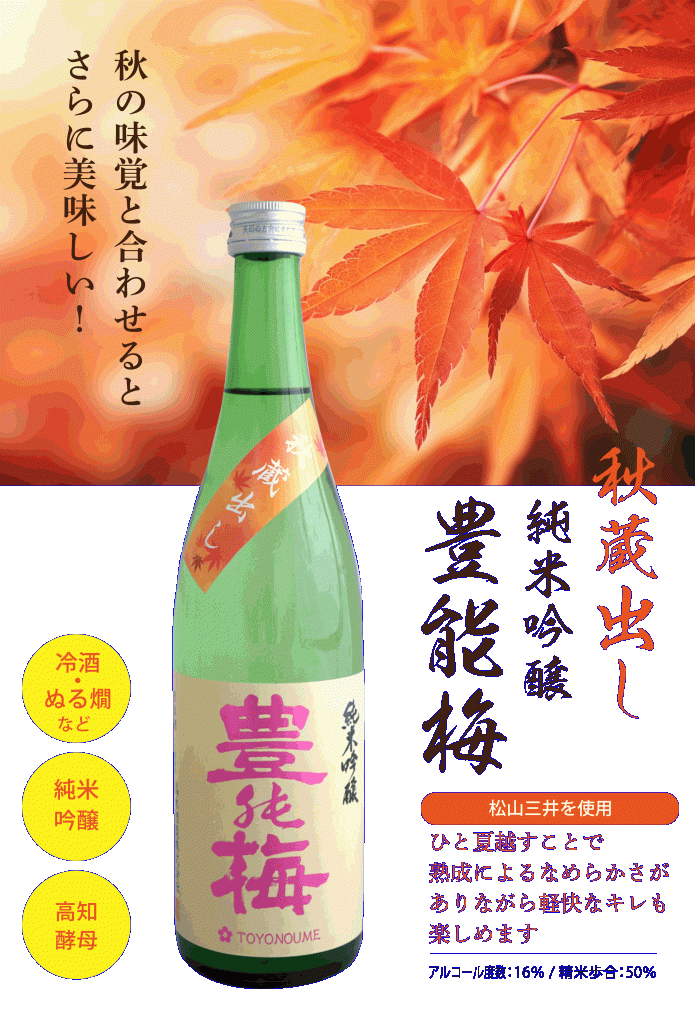 純米吟醸秋蔵出し 2024.08.30 豊能梅 純米吟醸 秋蔵出し 9月より発売です。松山三井を50%まで磨き、高知酵母AC95で醸した純米吟醸を冷蔵庫で瓶熟成させました。夏を越し、適度に熟成をした秋飲み頃の純米吟醸です。■豊能梅 純米吟醸 秋蔵出し