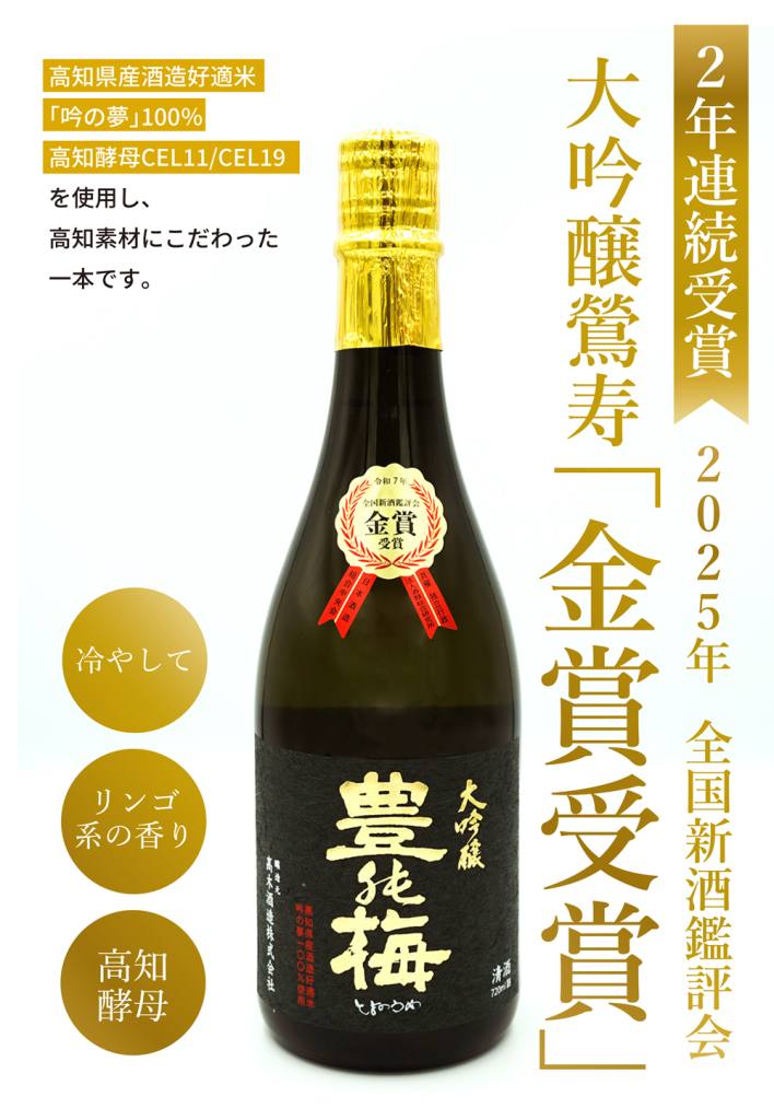 全国新酒鑑評会金賞受賞 2025.05.30 吟の夢を100%使用し、高知酵母で醸した土佐の酒蔵としての志を込めた大吟醸です。本年度も高知素材100%で全国新酒鑑評会に挑戦をしました。お陰様で、昨年に続き金賞を取ることが出来ました。■ 豊能梅 大吟醸 鶯寿2025金賞受賞酒■ 豊能梅 大吟醸 しずく酒2025金賞受賞酒(袋つり品)
